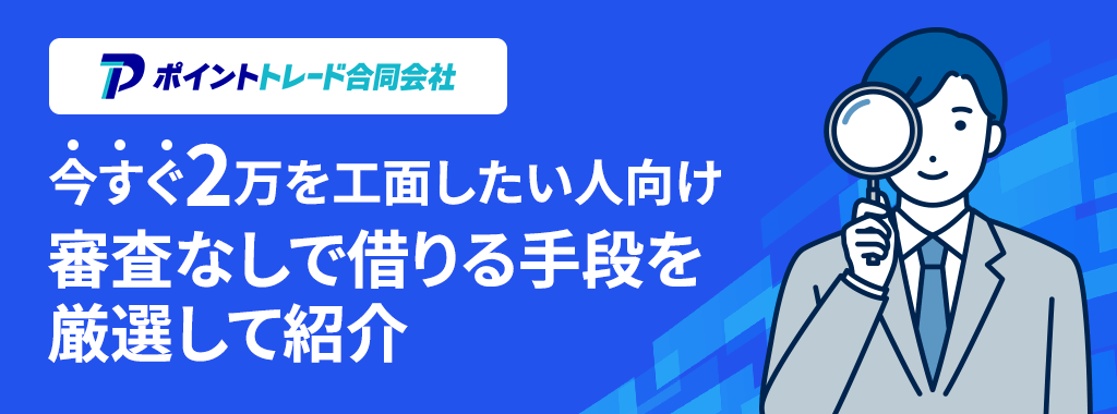そこでこの記事では、2万円を借りたい方に向けて、審査なしで借りる方法や即日融資に対応している消費者金融カードローンを紹介していきます。今日中に2万円を稼ぐ方法も解説するので、今すぐ2万円を工面したい方は必見です!